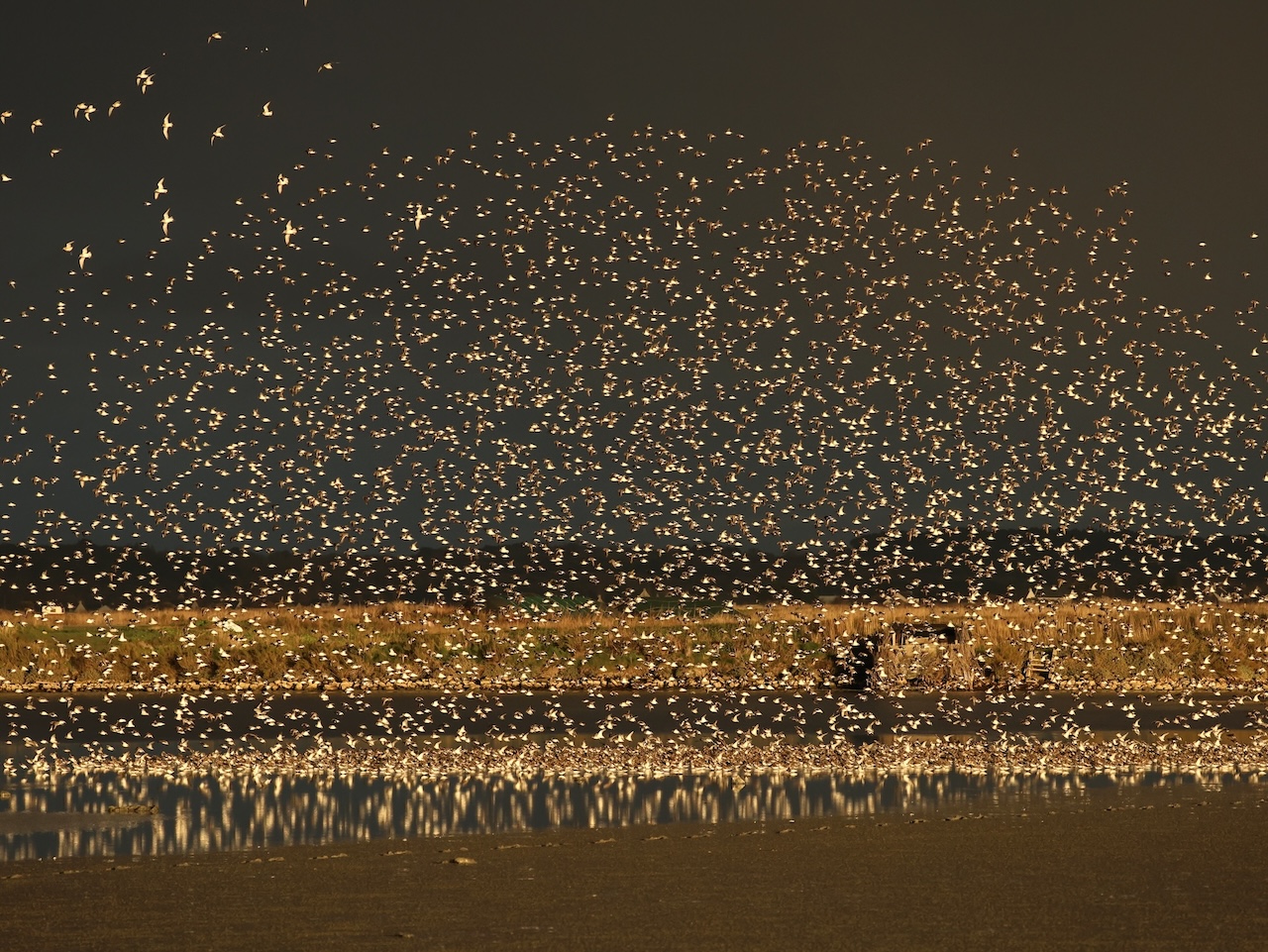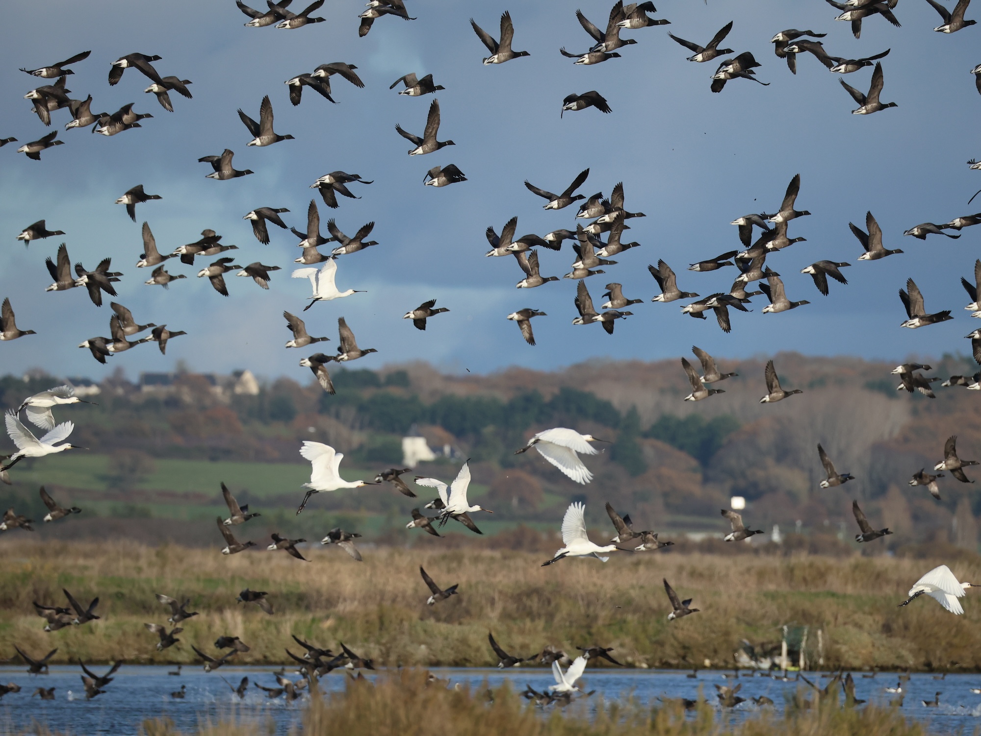 A marée montante, tout ce petit monde s’agglutine et donne naissance à des tourbillons d’ailes, sous le cancanement permanent des bernaches cravants et le ballet des spatules blanches.